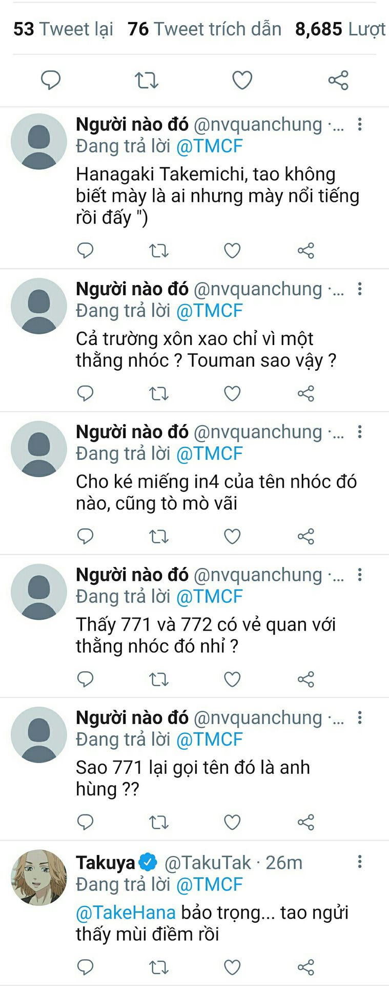 Takemichi cảm ơn những người đã follow cậu, nhưng mà đừng có spam tin nhắn đòi xem mặt cậu được không ( ᵒ̴̶̷᷄ д ᵒ̴̶̷᷅ ) cho mấy thằng đực rựa xem mặt nó cứ sao sao ấy nên cậu chả thích tí tẹo nào.