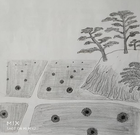 The ground was crisscrossed with many dirt paths shaped like the ridges of rice fields, forming circles around patches of swamp. The swamps were a deep purple color and were densely covered with numerous small holes. These holes had a diameter of about 50 centimeters, and around each hole, there was a ring of light purple mud.