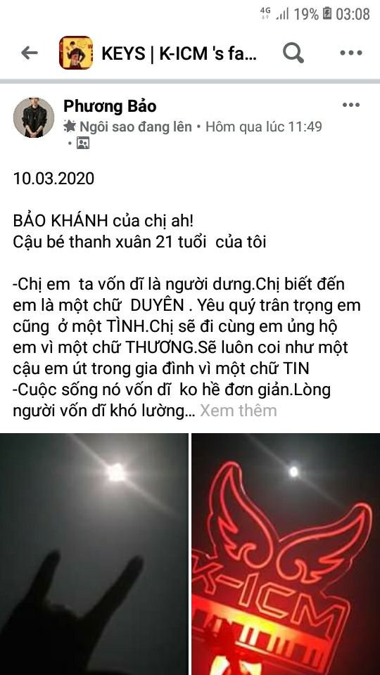 BẢO KHÁNH em trai của tôi."- Nguồn (bài viết của nick Facebook chị " Phương Bảo" đăng trong group (nhóm Facebook) FC chính của K-ICM: "KEYS | K-ICM's Fanclub"