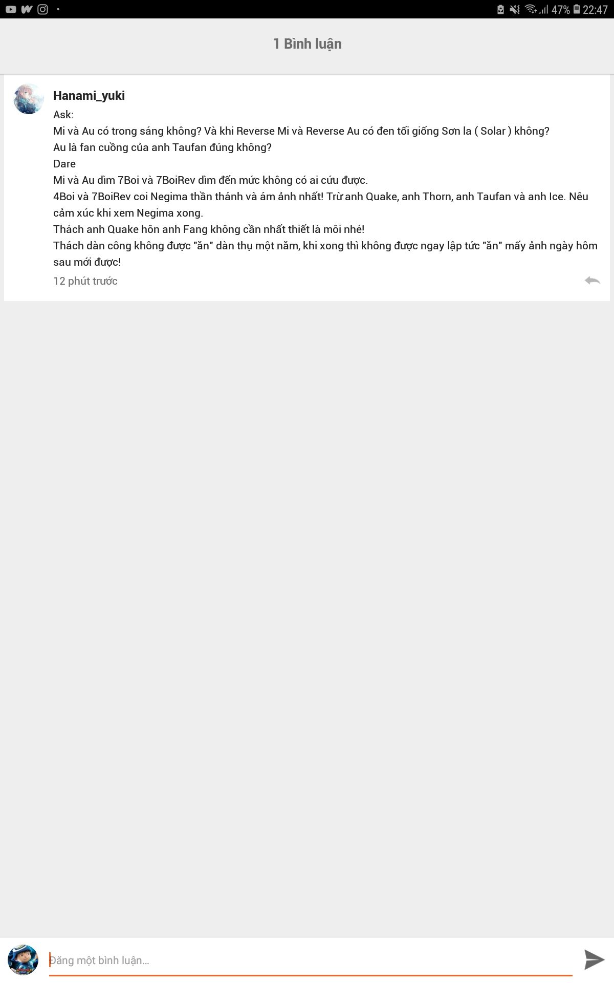 Mi : Haha,làm đi mấy anh