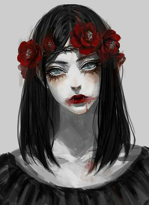 Đôi mắt xám sáng, cùng 2 chiếc nanh đang chìa ra trên khuôn miệng đầy máu, cả xác một con nai nhỏ dưới chân cô ta nữa