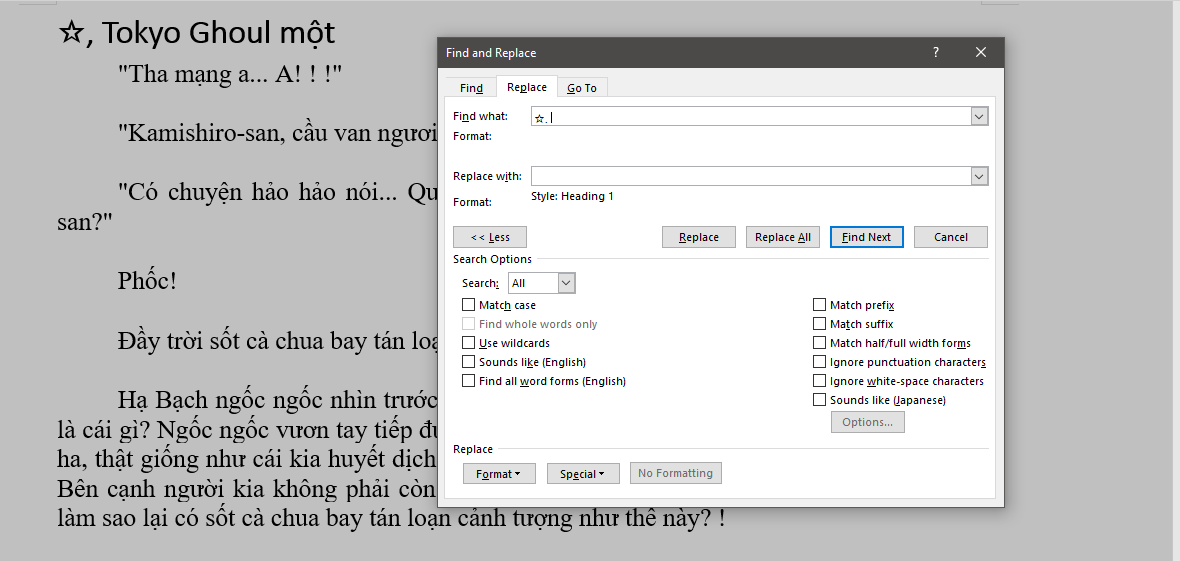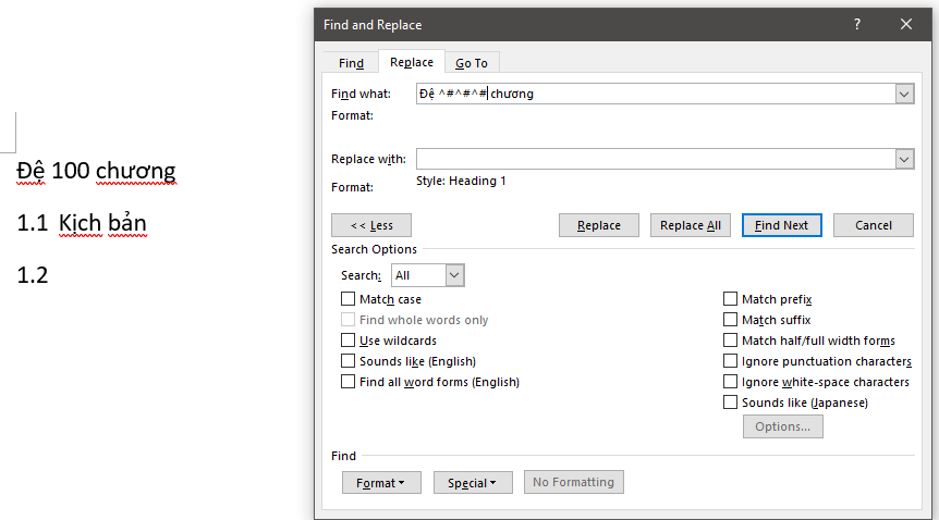 8 - Nếu mọi người chú ý trong search and replace mình viết Chương ^#^#: