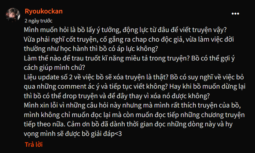 2) Thực sự thì thời gian đầu khi mình viết bộ truyện này cũng khá áp lực khi cần phải cân đối giữa học và viết truyện. Cũng khá buồn khi thấy đứa con của mình hay như vậy mà tại sao lại quá ít người biết đến. Lí do mình drop từ chương 13 là vì mình quá nản khi view và vote lẹt đẹt, phần nữa là do quá tập trung vào truyện nên kết quả học tập của mình không được như ý.