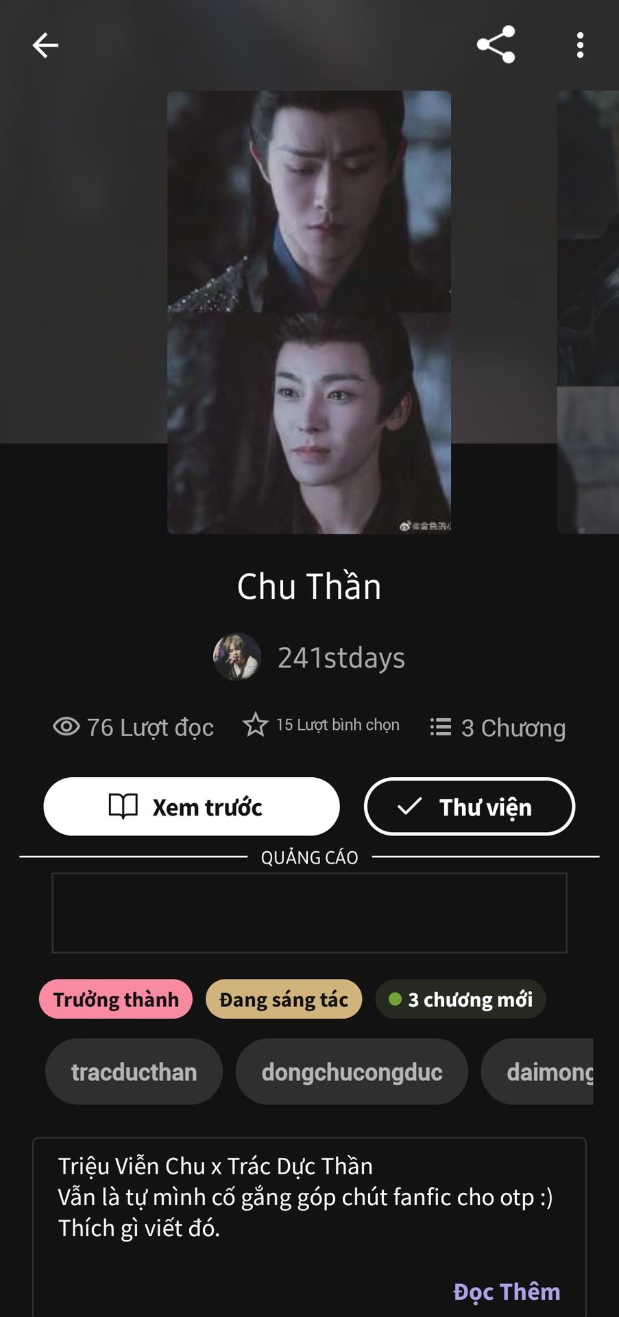 Ai đang đói fic Chu Thần giống t thì có thể đọc thử bộ bên dưới nha. Thích gì viết đó thôi nên không có hứa hẹn gì về nội dung hay số lượng fic được. Bao gồm đoản với fic ngắn. (Hiện tại mới chỉ có giới thiệu và một phần đầu tiên thôi, số 3 đó là tính luôn cả bản thảo chưa đăng.)