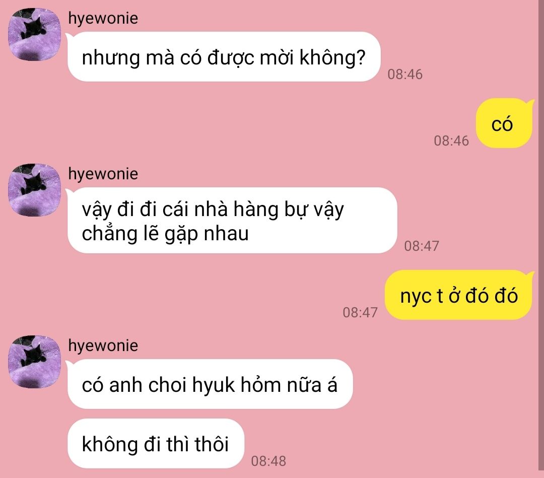 "Giờ không đi là không có cách nào gặp nhau tự nhiên vậy nữa đâu nha hai." (Tin nhắn từ Hyewonie)