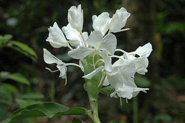 Cành khương hoa nở ra năm đóa hoa, mỗi đóa có ba cánh hoa xòe rộng đẹp như cánh bướm.