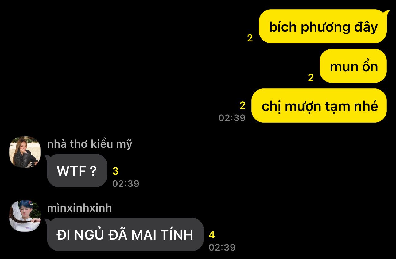 em nghe thấy tiếng nói thì ngẩng đầu. thơm quá, đẹp quá. bùi bích phương hôm nay thân váy lụa đỏ ôm sát, tóc nâu xoăn nhẹ, khí chất át hết những cô cậu trẻ tuổi đang say sưa trong không gian ồn ào này này. nàng bật cười khi thấy phản ứng cứng đờ của hằng. trông khờ khạo quá.