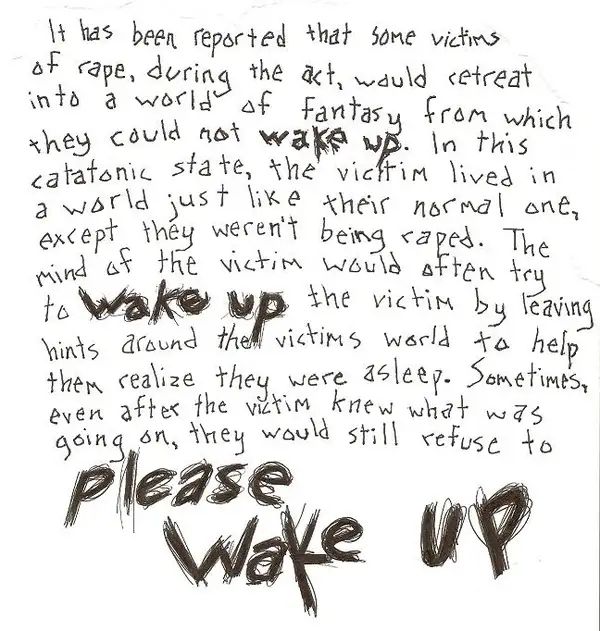 Trong quá khứ, nhiều người đã ghi nhận rằng khi cơ thể của con người bị tra tấn, ý thức của họ về thế giới thật sẽ mờ dần và họ sẽ tạo ra một thế giới ảo tưởng mới. Thế giới ảo tưởng này giống hệt với thế giới bình thường mà những nạn nhân vẫn thường sống, nhưng điểm khác biệt duy nhất là trong thế giới mới này, họ không phải trải qua việc bị tra tấn. Tuy nhiên, não của con người rất thông minh và sẽ thường để lại những ghi chú nhỏ trong thế giới ảo tưởng này, bảo rằng họ hãy THỨC DẬY ĐI Tuy nhiên, có những trường hợp nạn nhân sẽ không THỨC DẬY trong vài tháng tiếp theo.
