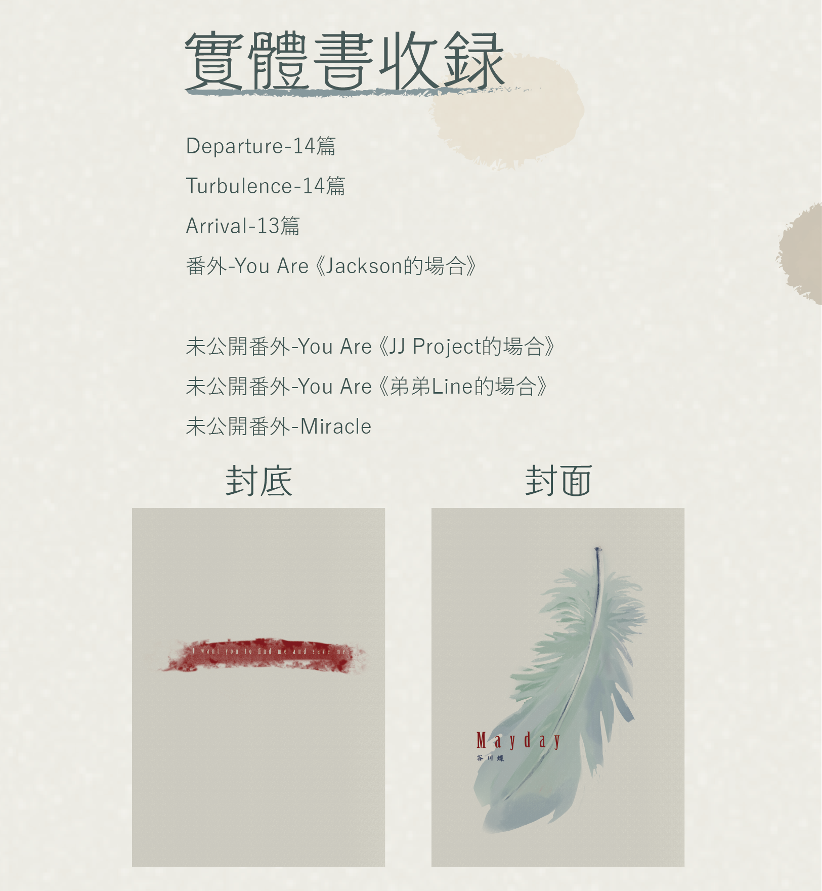 Editor: - Như thông báo trước đó sách ra và có nhiều phần không công khai, trước đó tác giả dự tính có PN của Mark <Uninstall>, <You Are> và <Đêm> rồi còn <PN của riêng Youngjae> và Kết cục của <ải các thành viên chết>. Nhưng lại không thấy nhắc đến, có lẽ đã bỏ rồi, cái này tui không biết được ^^