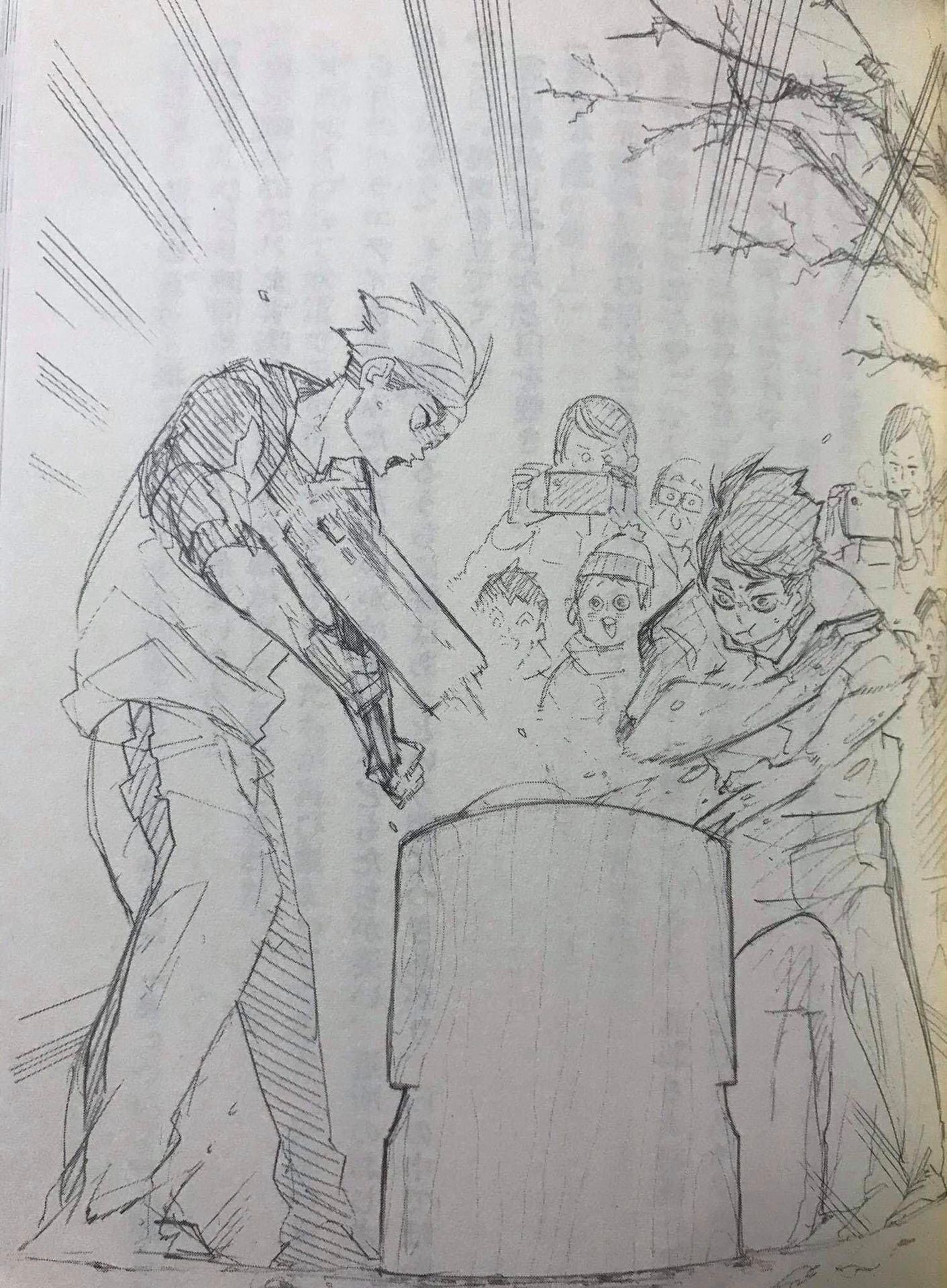 Tsumu hăng máu, Samu càng hăng, và tiếng cười ầm ĩ xen lẫn tiếng chê bai của lũ trẻ con cũng càng nổi bật hơn. Trước bối cảnh kêu "ha! ha!" đầy nghị lực và dũng mãnh đó, lời bình phẩm "tệ quá", "còn tệ hơn cả anh trai tao làm mày ơi" vang lên khi hội người lớn vây quanh xấu hổ bảo chúng im lặng.
