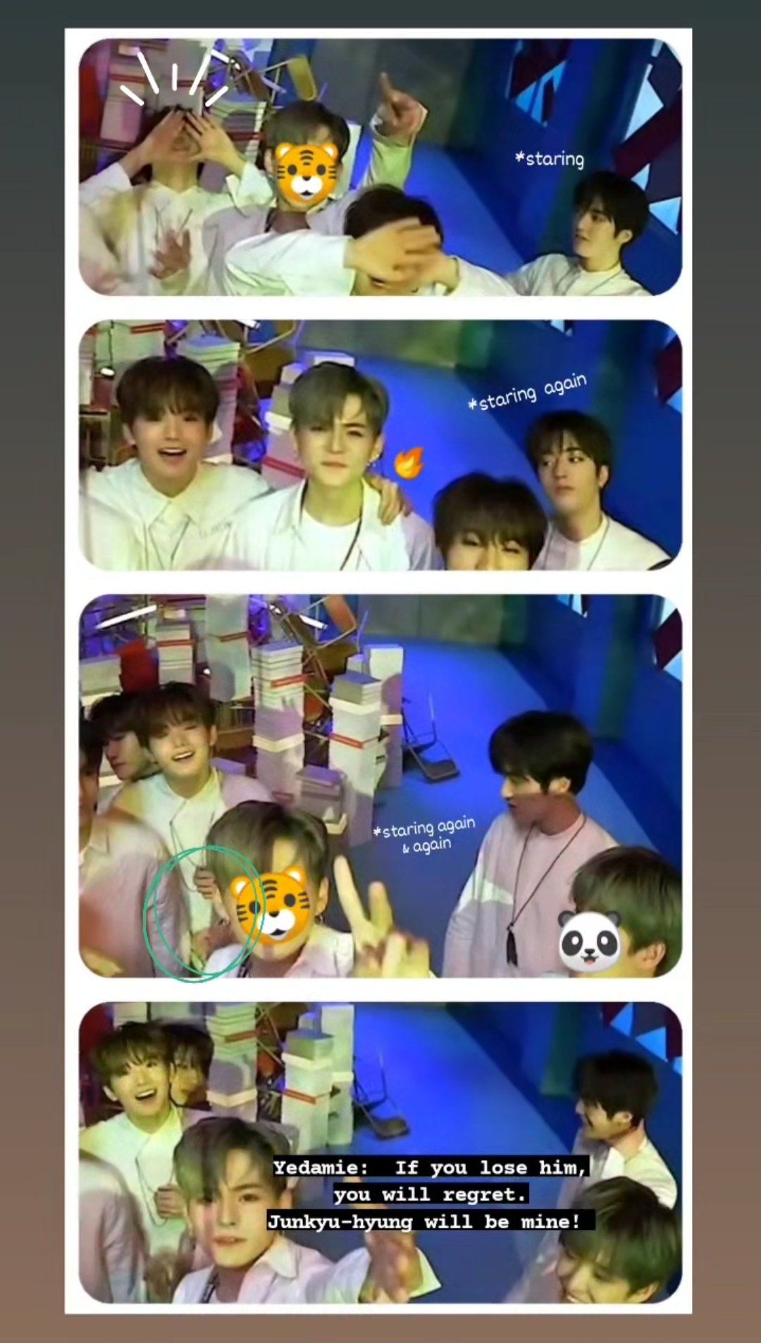 Gần đây Junkyu luôn skin-ship với các thành viên khác đặc biệt là Mashiho. Và điều đó khiến cho Haruto gần như tức điên lên. Haruto biết bản thân là một người có tính chiếm hữu cao, thế nên Ruto luôn cố gắng khiến bản thân có thể tiếp xúc với Junkyu nhiều nhất có thể, mọi lúc mọi nơi, ôm dựa, hôn gió, tất cả mọi thứ có thể giúp Haruto khẳng định Junkyu thuộc về Ruto và của một mình Ruto. Thế nhưng đời không như là mơ, YG staff đã ngăn lại và nói với Haruto rằng Junkyu sẽ có một cp riêng với Mashiho, và Haru sẽ là một cp với JeongWoo và Asahi thế nên từ bây giờ họ không muốn Haruto có bất kì tiếp xúc thân mật nào quá mức với Junkyu trên show, Vlive thậm chí là ở hậu trường cũng không thể.