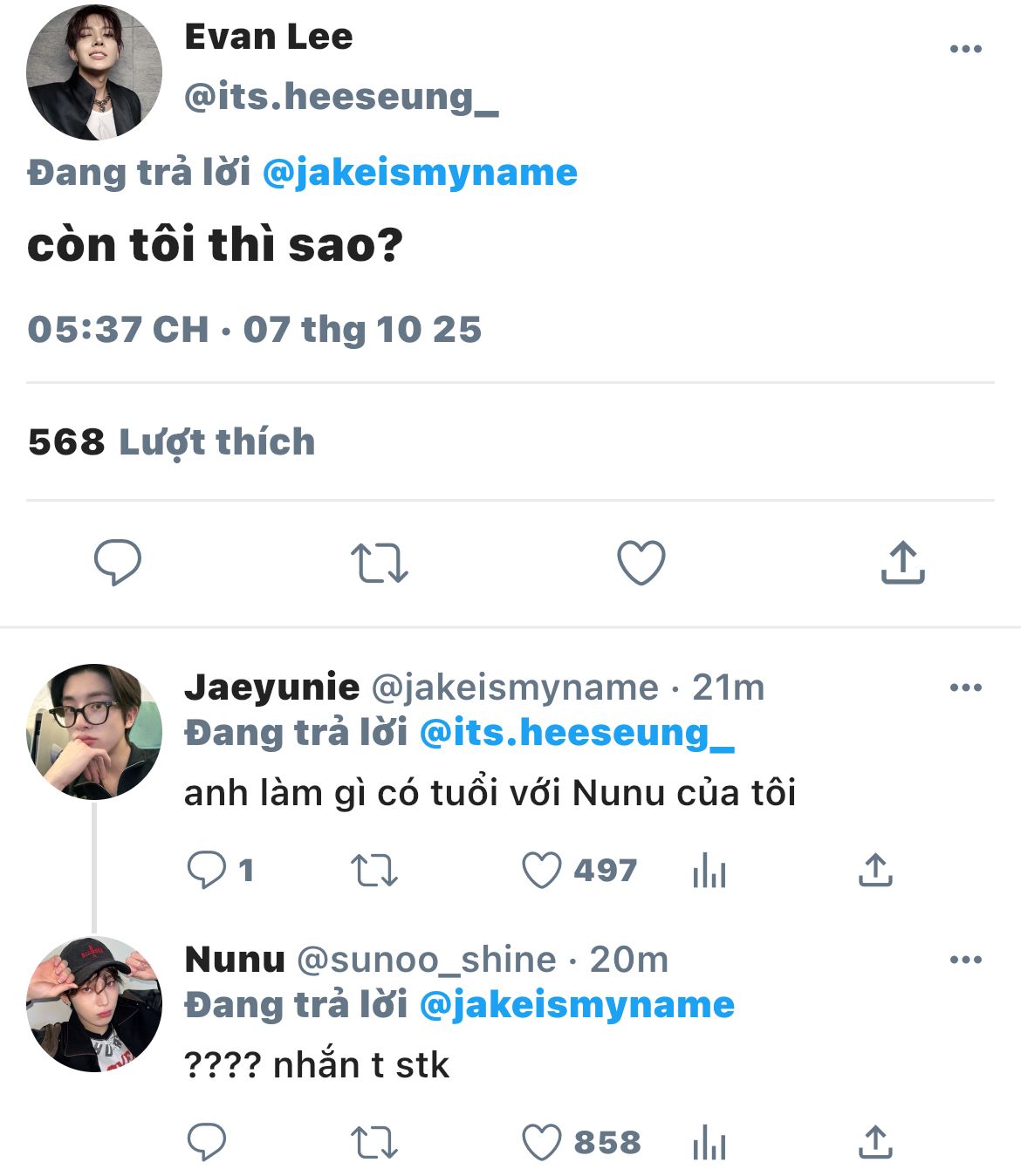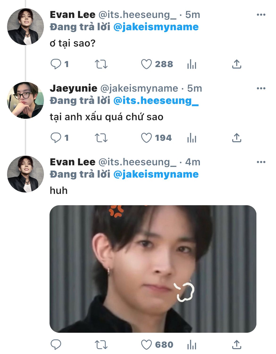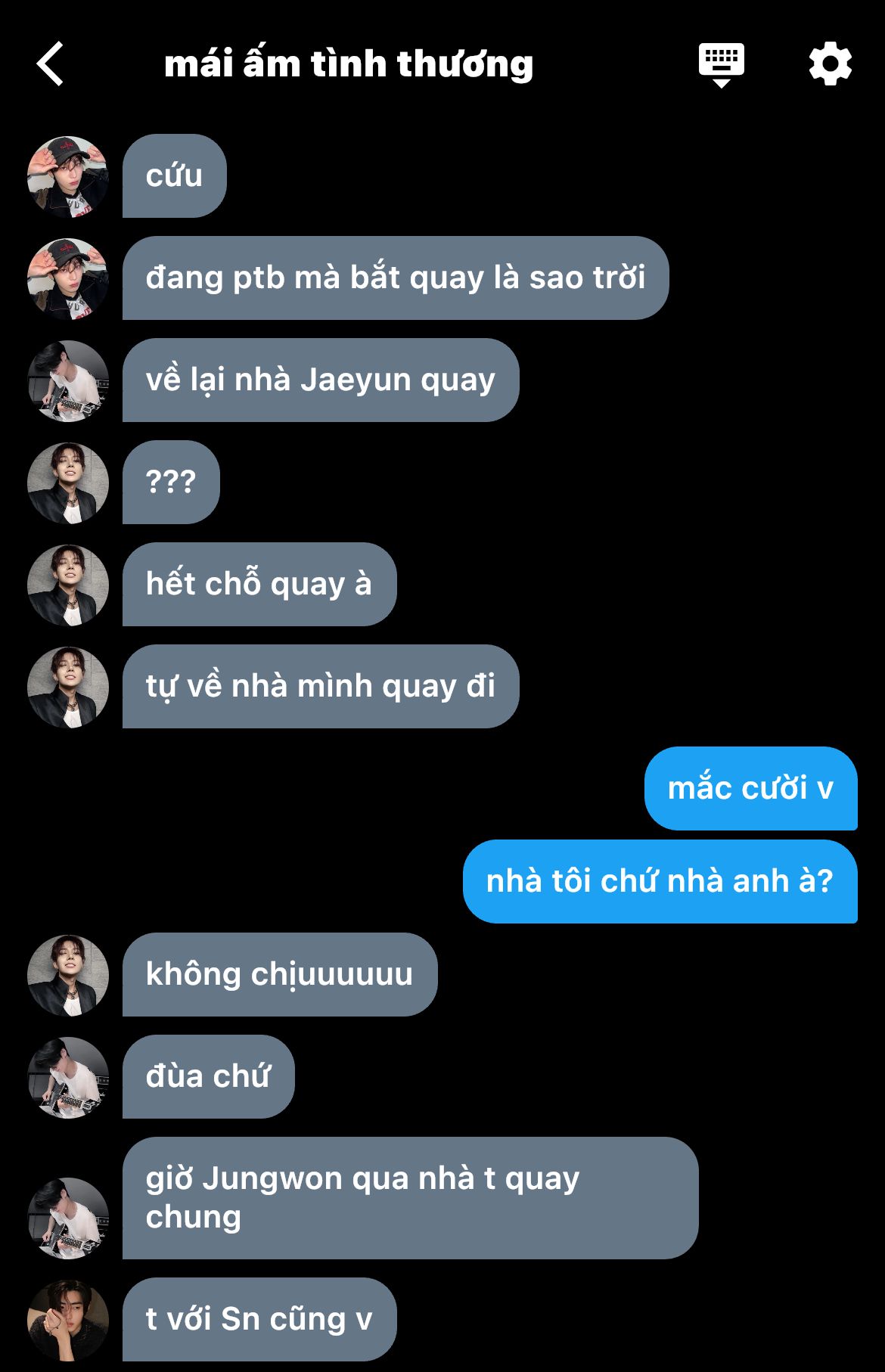 "Jaeyunie nhắn với ai mà lâu thế?" _ hắn từ từ chòm qua nhìn tin nhắn trong điện thoại em, nhưng chưa kịp nhìn rõ chữ đầu là gì em đã vội úp máy xuống ghế, quay sang gay gắt với hắn: "Đừng có tự tiện!"