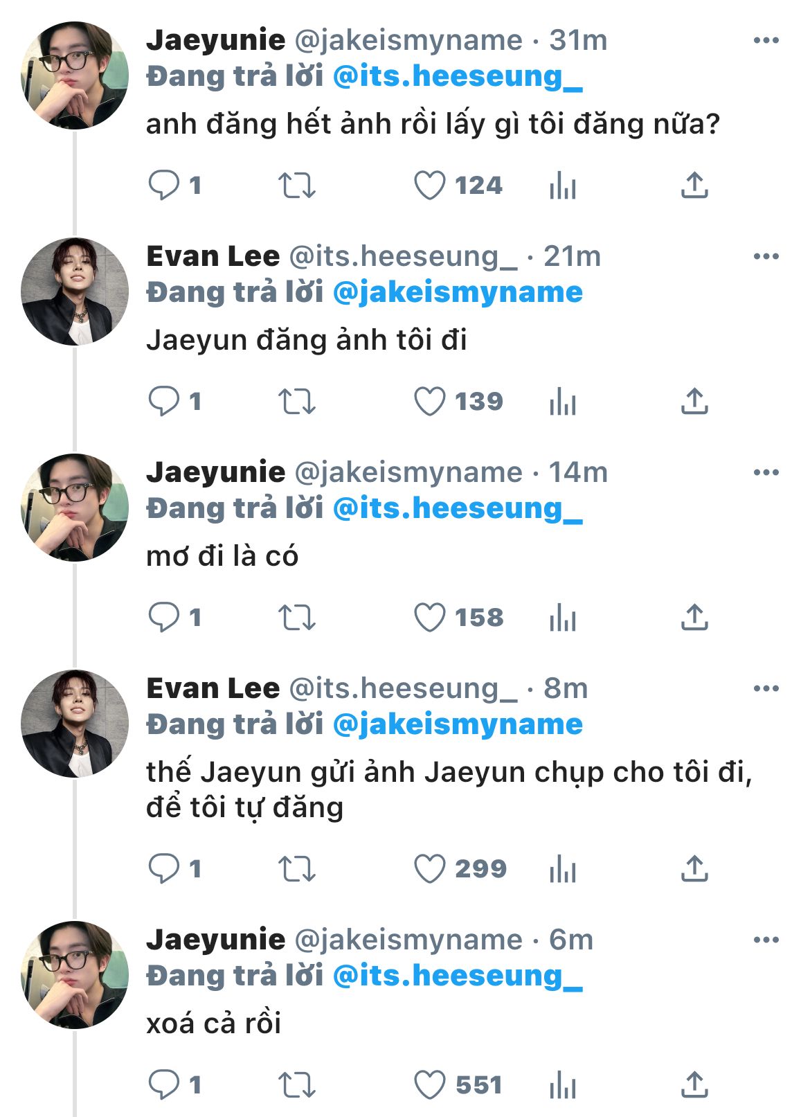 "Jaeyun à, em tắt điện thoại đi, chơi với tôi này." _ hắn ngồi cạnh, dùng hai ngón tay kéo nhẹ vai áo nhắc nhở em.