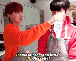 ~ Thế là Hobi lại đút nước thêm cho cậu em. Còn cẩn thận để tay phía sau đỡ cổ JK nữa ('・ω・´)