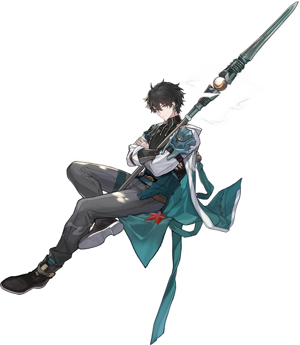 Anh ta mặc một chiếc áo cổ lọ màu đen cùng với một chiếc áo khoác màu trắng và xanh lá cây, có các điểm nhấn màu vàng và khói và một bộ giáp ngọc trên vai trái. Anh ta mặc quần màu xám và đi giày cao cổ màu đen có đế trắng, đeo một chiếc khuyên tai tua rua bằng ngọc bích theo phong cách phương Đông có dây buộc vào tai còn lại.