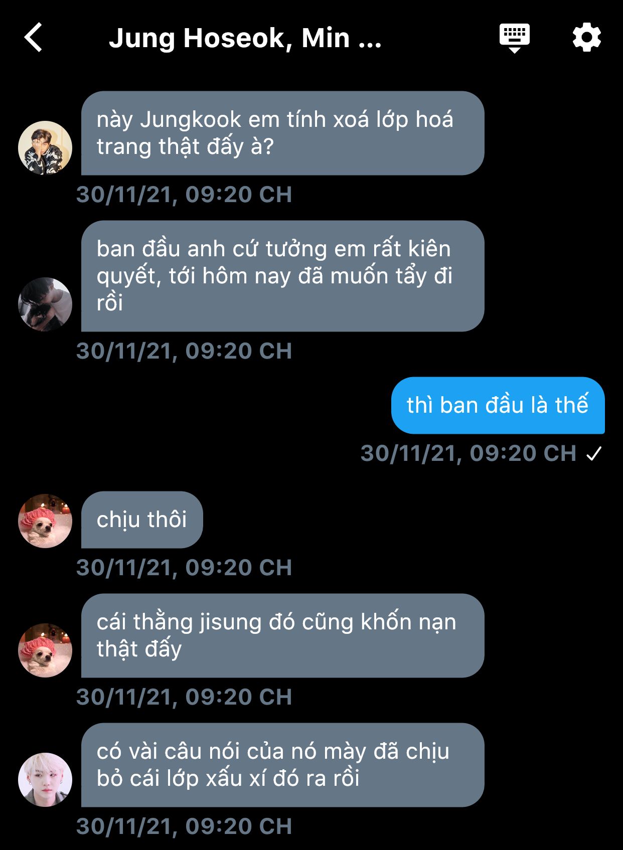 - Tao nói là cái loại xấu xí như mày thì dù có tốt tới mấy cũng không có được tình cảm của anh Jimin đâu. Nhìn lại mày xem, mặt thì đầy mụn, đầu tóc thì bù xù bê tha, thân hình thì cũng chẳng phải cân đối, chẳng phải...