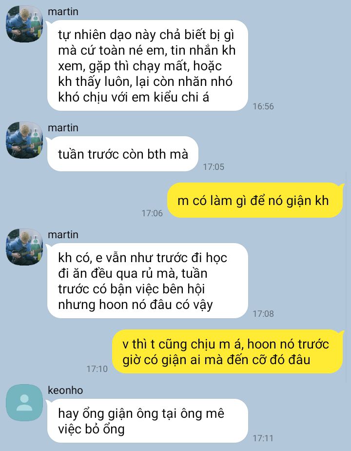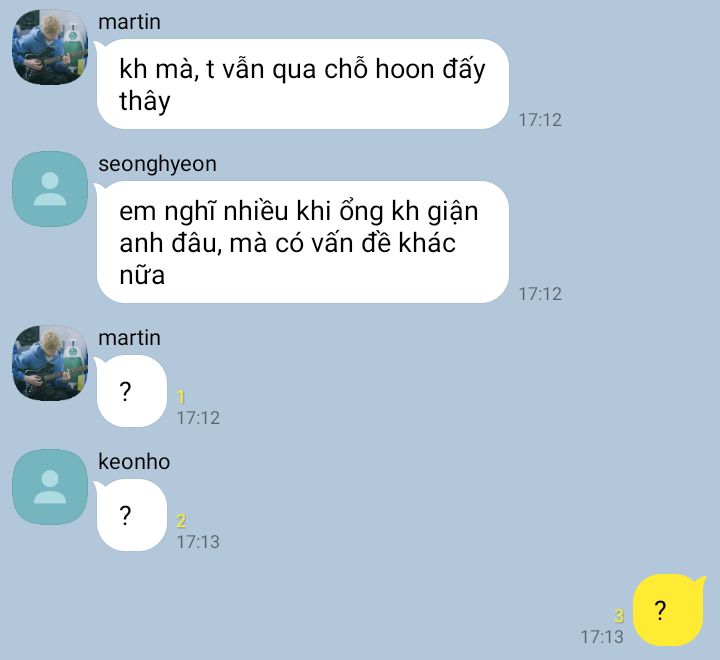 " Thế tại sao lại không trả lời tin nhắn tao, còn không thèm đợi tao đi cùng nữa, muốn rủ mày đi ăn cũng không thấy đâu. Rõ ràng là tránh tao Seonghyeon nó còn nhận ra kìa. Không tính cho tao một lời giải thích à? "