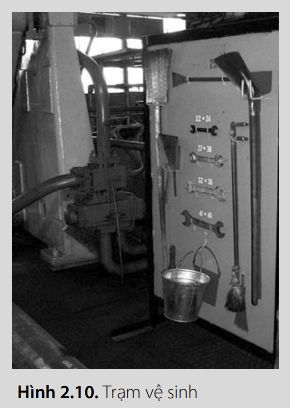 Một vấn đề phổ biến trong các xưởng là thiếu dụng cụ vệ sinh. Vì vậy, có thể có trách nhiệm vệ sinh, nhưng không có dụng cụ hoặc giẻ lau để làm vậy. Do đó, để đảm bảo nhu cầu hợp lý cho việc dọn dẹp nơi làm việc, trước tiên cần cung cấp cho người lao động tất cả những gì cần thiết (Hình 2.10). Sau đó, khi những dụng cụ này bị mòn, dụng cụ vệ sinh mới nên được mua sắm định kỳ.
