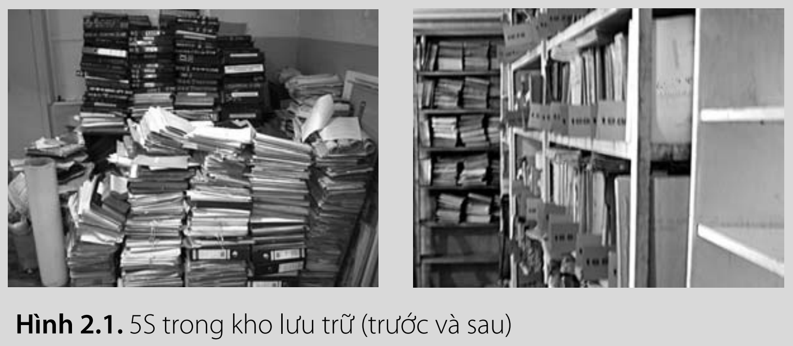 Để triển khai hệ thống 5S, một chỉ thị đã được ban hành để giới thiệu nó trước tiên trong bộ phận kế toán, nơi mà trật tự giữa các giấy tờ là quan trọng nhất. Việc triển khai 5S đã giúp xác định văn phòng phẩm dư thừa và các vật dụng không sử dụng đã nằm không trong nhiều năm (Hình 2.1). Một xe tải đầy giấy lãng phí đã được loại bỏ. Càng ít đồ không cần thiết, bạn càng cảm thấy thoải mái và có nhiều không gian hơn.