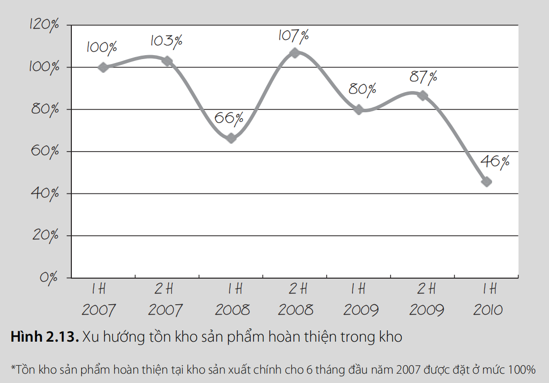 Khi phân tích các sản phẩm hoàn thành chưa bán trong kho, hóa ra một phần lớn là các sản phẩm phụ có nhu cầu hạn chế. Chúng được sản xuất mà không có đơn đặt hàng cụ thể, một cách ngẫu nhiên. Một phần khác là các sản phẩm được làm "chỉ trong trường hợp", dần dần rời kho. Do đó, để giảm lượng hàng tồn kho sản phẩm hoàn thành, cần giải quyết hai nhiệm vụ: giảm sản xuất các sản phẩm không có đơn hàng trong khi bán hết các mặt hàng chưa bán được. Theo thời gian, những nhiệm vụ này đã được hoàn thành (Hình 2.13).