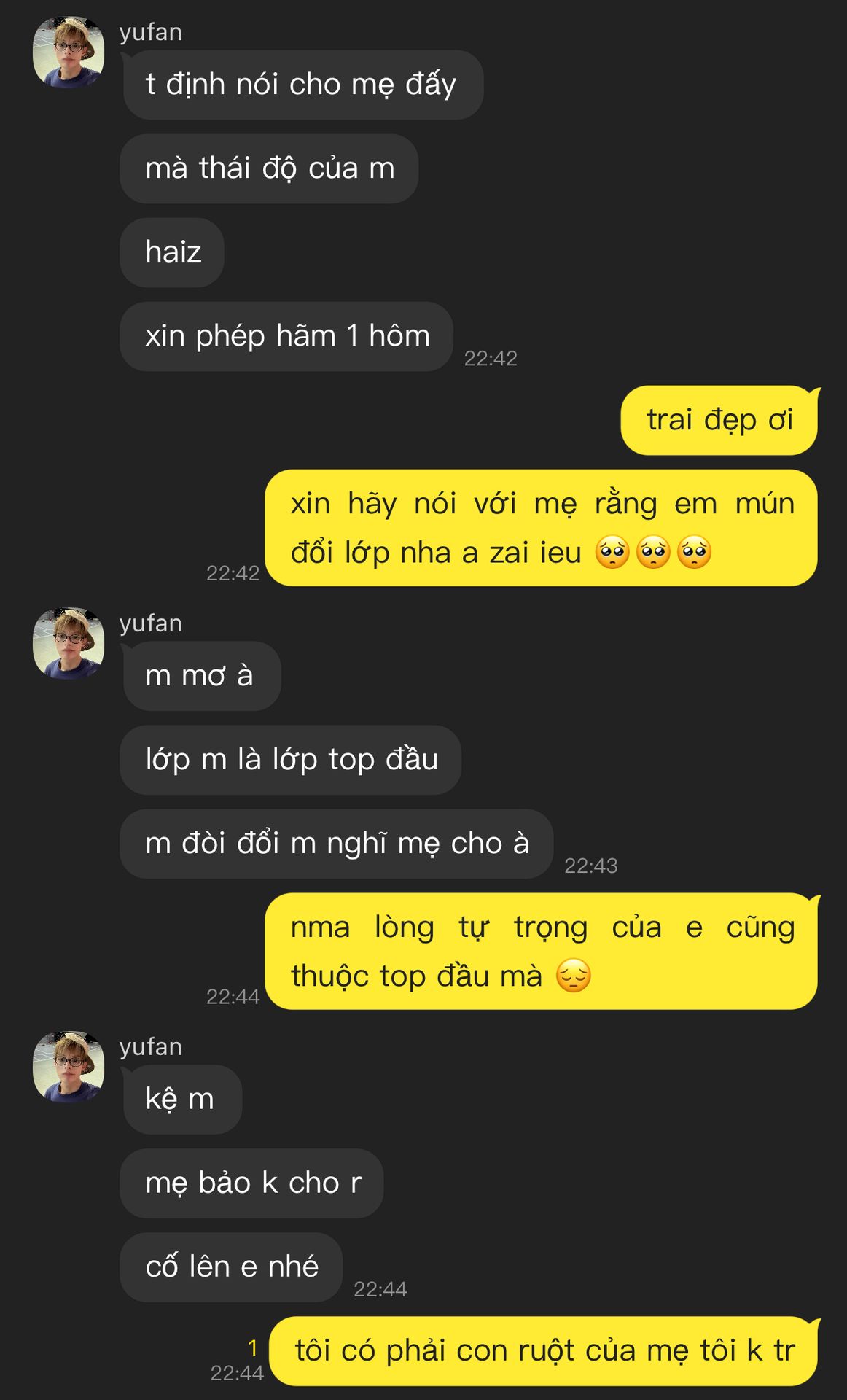 ' ôi em rai iêu quí cụa tôy xao lại ra lông lỗi lày trứ, trỉ vì bị zai ghốt mà bây rờ đòi nghỉ học. Ông trời ơi thươn em rai tôy qá' - james lao lên ôm seonghyeon rồi lay người dữ dội
