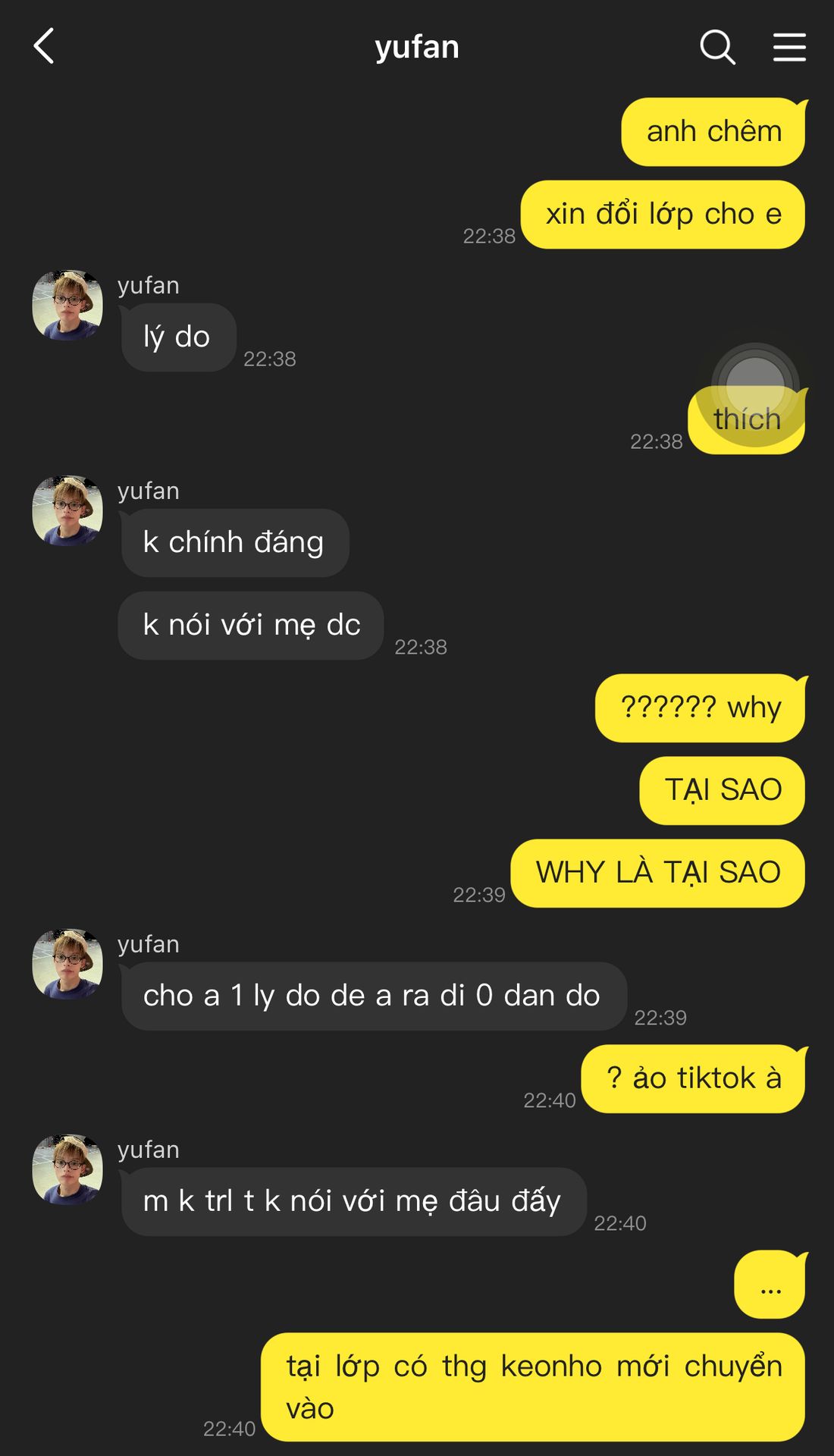 ' sao mẹ không cho em chuyển lớp, em không thích học với cái thg đó đâu huhu '
