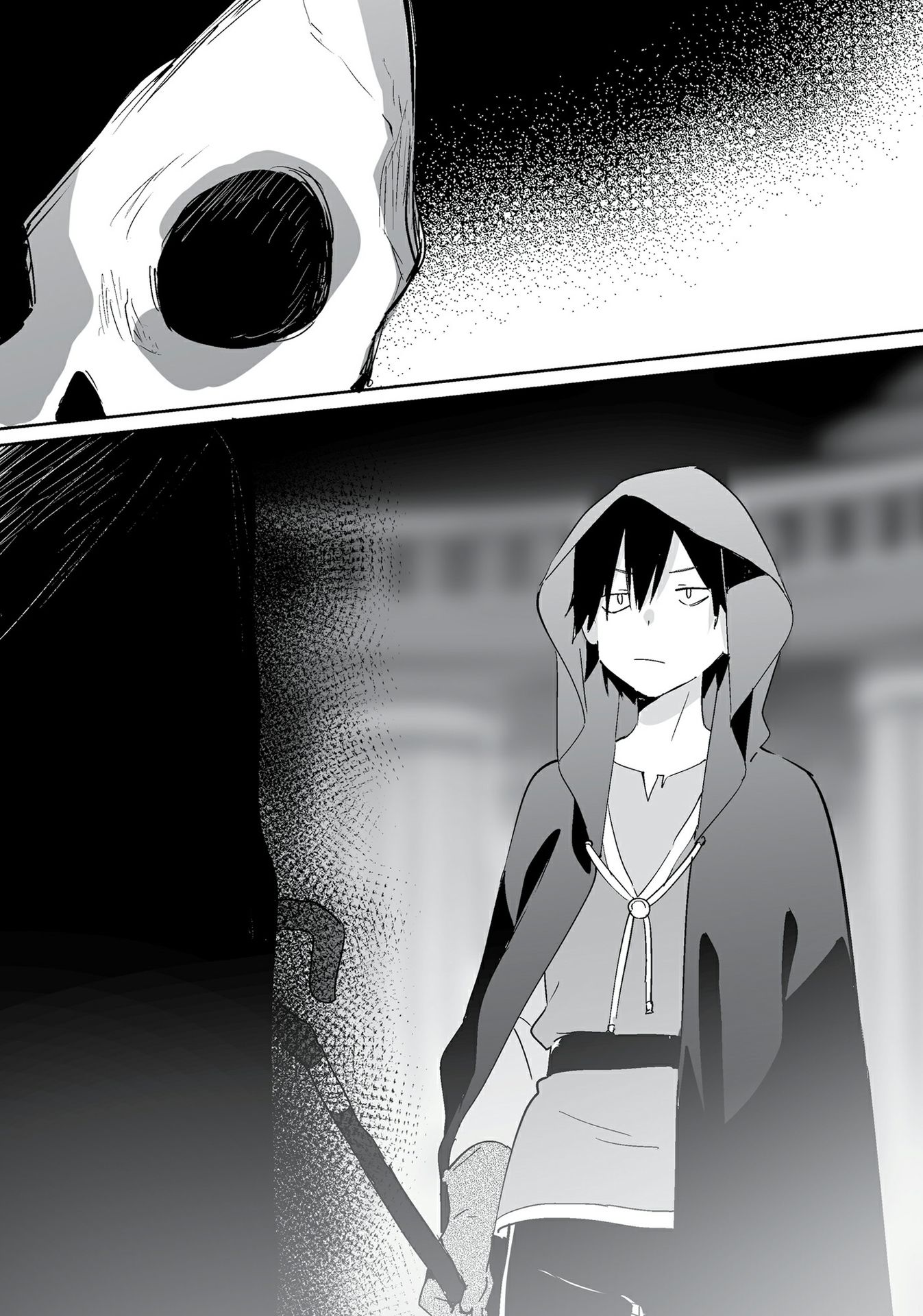 Tôi đi trước mặt nó. Nhìn chằm chằm vào những lỗ trống trong hộp sọ nơi lẽ ra là mắt, tôi chỉ thấy bóng tối, dù bóng tối đó dường như đáp lại ánh nhìn của tôi. Sau đó, khoảng cách giữa chúng tôi biến mất.