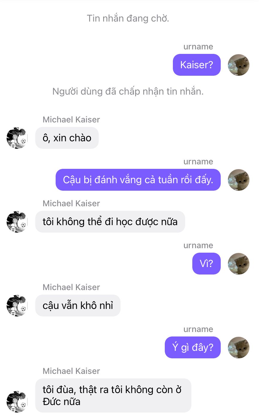 Cả một tuần tiếp theo đó, tên Kaiser cứ liên tục mua đồ ăn vặt và một vài món đồ đến, bỏ vào học bàn của em. Em biết chắc, vì ngoài cậu ta thì chẳng còn cậu trai nào có thể "tự tiện" để đồ vào chỗ em như vậy.