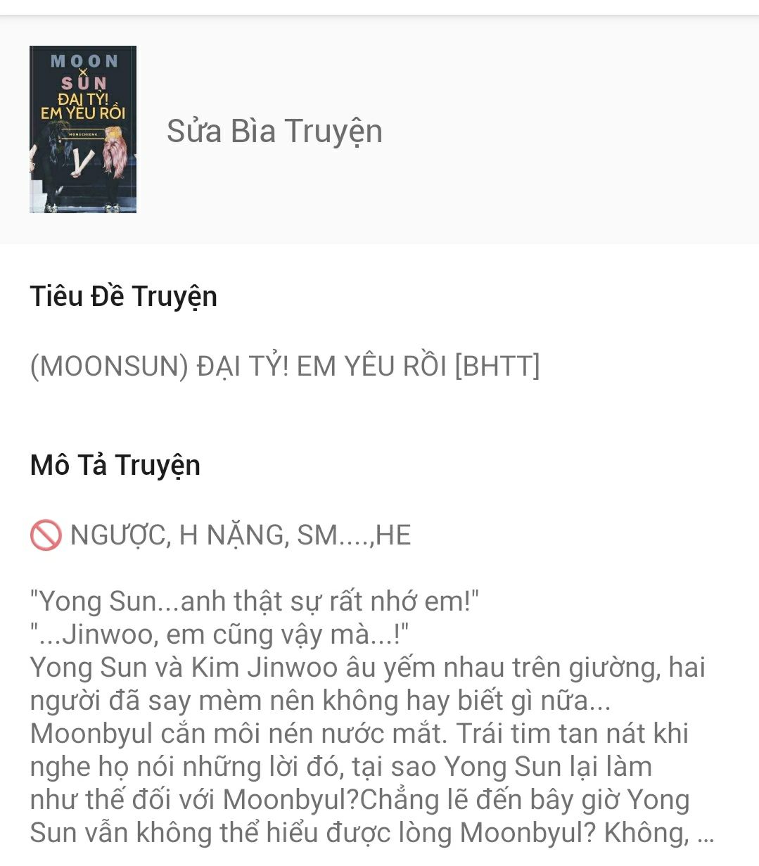 "Đặt câu hỏi, nếu như thai phụ trong thời kì mang thai, tình dục đặc biệt cường thịnh nên làm sao? người yêu của lâu chủ có bảo bảo, nhưng luôn là muốn cùng tôi làm chuyện đó, nhưng mà tôi rất sợ hại đến đứa con, nhưng mà em ấy khó chịu muốn lại không thể không quản. Muốn biết tình trạng này nên giải quyết làm sao? gấp, đợi trực tuyến" Ở trên máy tính gõ vấn đề này, Yong Sun đỏ mặt nhấn gửi đi, còn tăng thêm treo giải thưởng hạn ngạch cao.