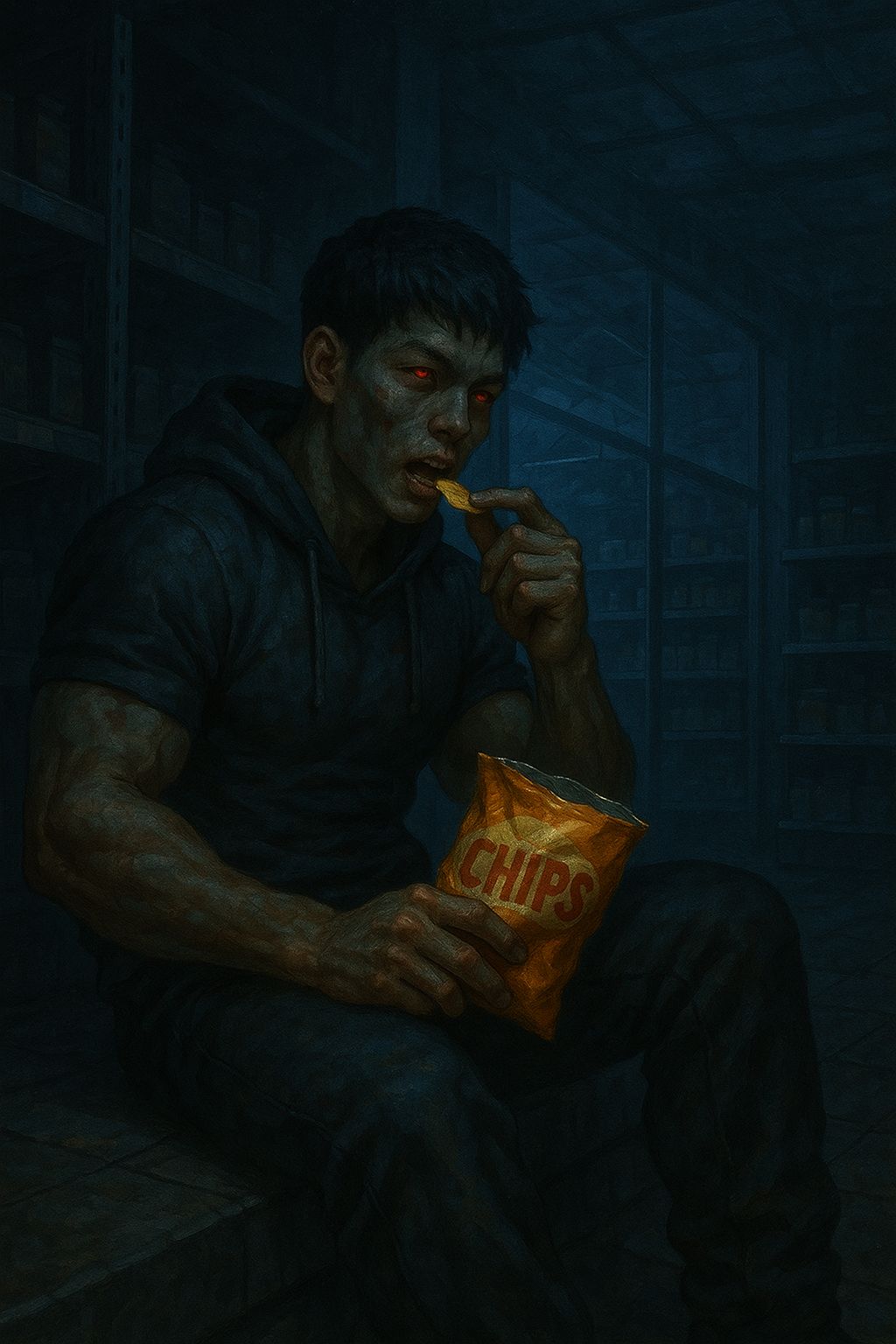 Anh đưa một miếng vào miệng. Âm thanh giòn rụm vang lên giữa không gian im lặng. Đôi mắt đỏ rực nhắm lại, khuôn mặt tái nhợt thoáng hiện vẻ hài lòng. Cảm giác ấy - vị mặn ngọt hòa quyện, vụn bánh tan ra dưới lưỡi - là thứ duy nhất khiến anh nhớ mình từng là con người.