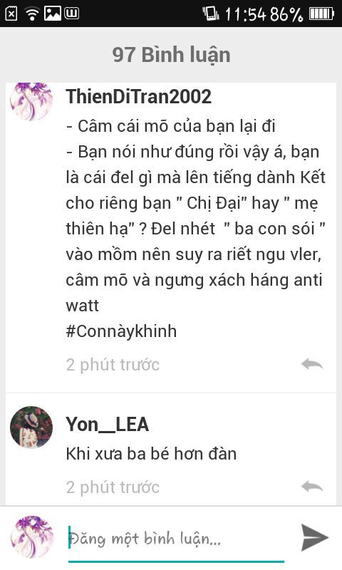 - :O Gái có bị điếm thúi hay không vậy? Nói người ta cướp bồ bạn là sao? Hm, con đũy điếm