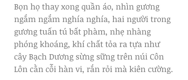 Điều thứ hai khiến mình cảm động chính là quá trình trưởng thành về mặt tinh thần và nhận thức của Bạch Tân Vũ. Ban đầu có thể nhiều người giống mình, không thích cậu ấy. Tân Vũ bất tài vô dụng, việc gì cũng chỉ biết mè nheo làm nũng. Xuyên suốt cả truyện, bạn thấy được nhận thức của cậu ấy về quân nhân, về cách hành xử, rồi về thế giới dần dần được thay đổi. Mình không biết phải nói như nào nữa, nhưng mọi người sẽ cảm thấy hài lòng lắm, thật sự đấy. Bạch Tân Vũ sau mấy năm mà thay da đổi thịt, từ một tiểu bạch kiểm trói gà không chặt, đến thành viên của đại đội Báo Tuyết, là một bộ đội đặc chủng có thể chạy mấy chục cây số dưới thời tiết âm ba mươi độ. Rồi cậu ấy sau khi xuất ngũ cũng biết những điều mình làm trước đây thật đáng trách, biết tiết kiệm, biết làm ăn, biết đối nhân xử thế. Thật ra bản chất cậu ấy trước đây vẫn là người lương thiện, nhưng chỉ là một tên ất ơ không có mục đích, không có lí tưởng sống thôi.