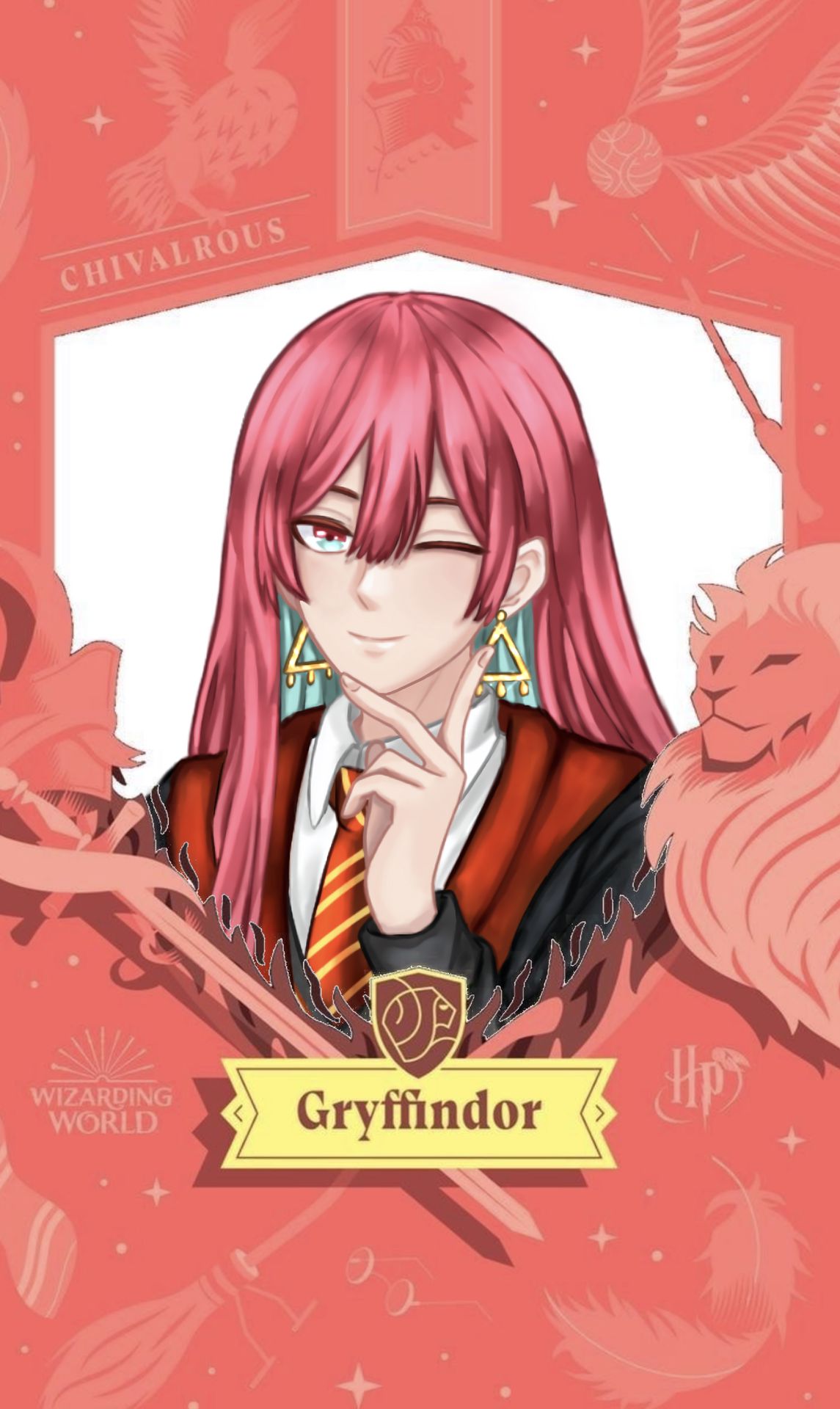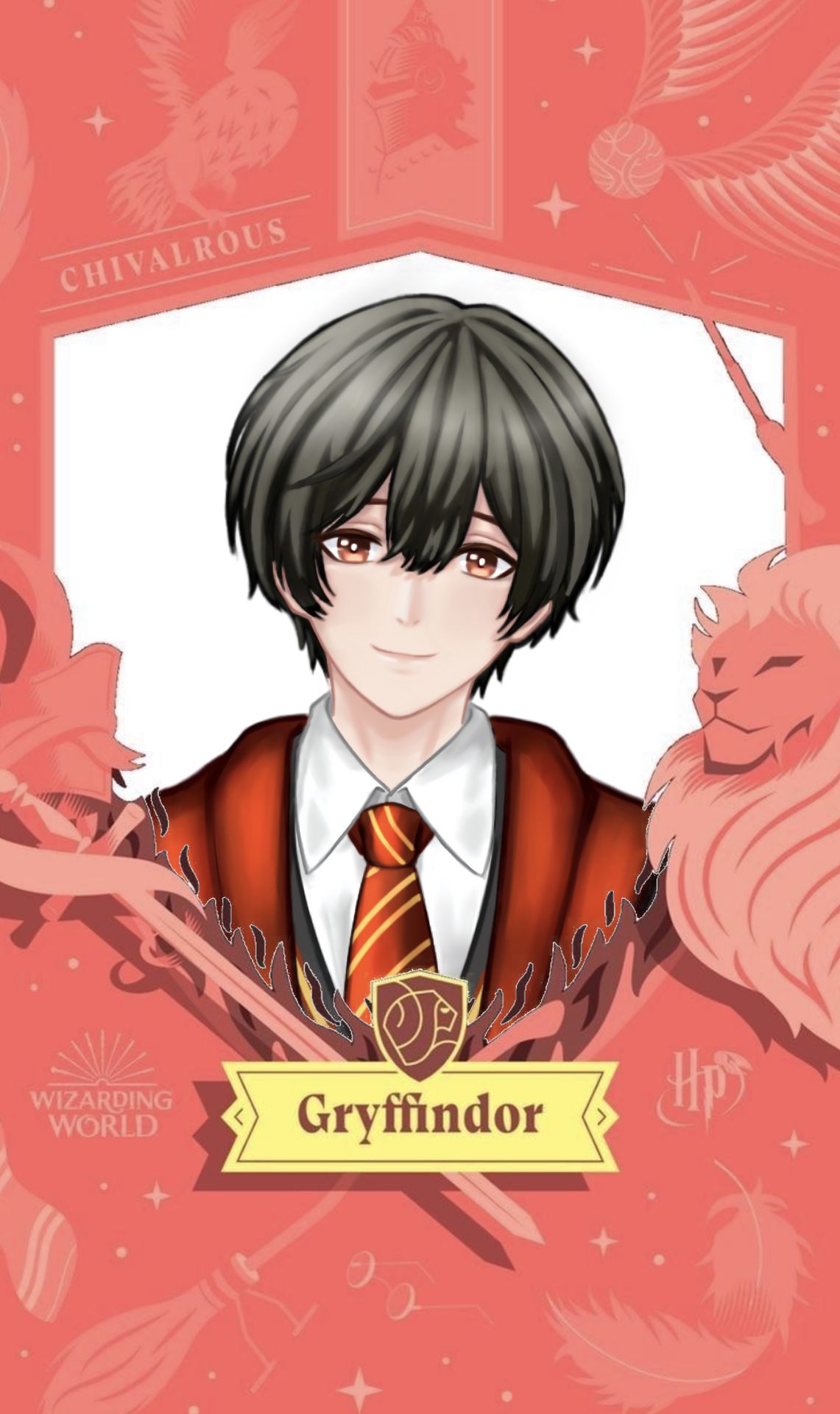 Cậu đeo chiếc áo choàng đỏ của đội nhà, nửa mở khoe phần áo bó sát bên trong, phần bụng lộ ra những múi cơ săn chắc. Găng tay da đã đeo sẵn, chổi bay dựng thẳng kế bên, cây Comet 290 mới được Cornelius - cha nuôi của cậu gửi tặng sang đầu năm học.