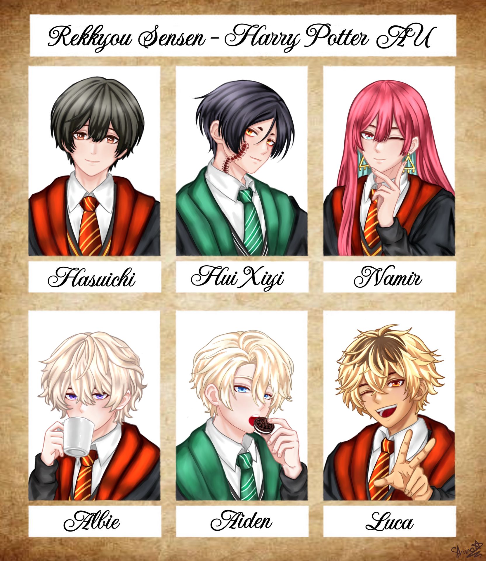 Một thân ảnh quen thuộc chậm rãi bước vào giữa vòng vây là Hasuichi Nishizono, cậu học sinh năm 6 nhà Gryffindor, thường được biết đến là người ít nói, điềm đạm, giỏi Thảo Dược học và Lịch sử Phép thuật. Tóc đen cắt tỉa gọn gàng, đôi mắt hổ phách ánh đỏ hiện lên vẻ lo lắng lẫn quyết đoán.