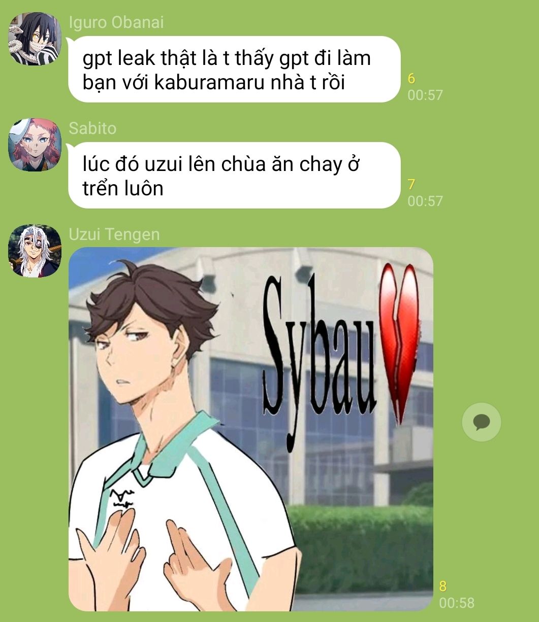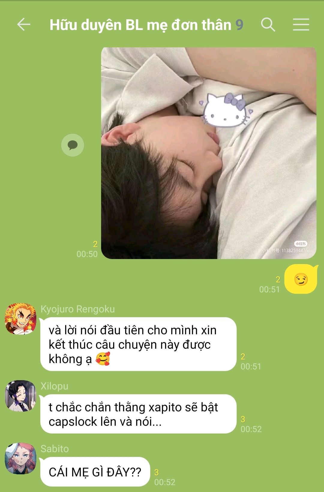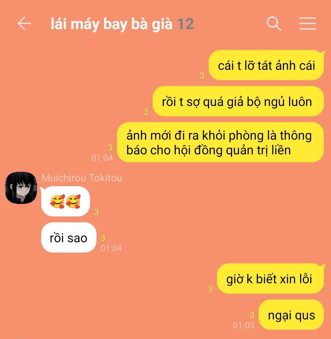 cậu mải mê gõ từng dòng tin nhắn cho bạn, kể lại cảnh tượng ban nãy bằng giọng điệu vừa bối rối vừa buồn cười. cậu không biết rằng ở ngay phía sau, có một bóng dáng cao lớn đã đứng đó từ lúc nào, im lặng nhìn từng chuyển động nhỏ của cậu. sanemi dựa vai vào khung cửa, đôi mắt ánh lên thứ gì đó vừa dịu dàng vừa trêu chọc. anh không vội lên tiếng, chỉ chậm rãi bước đến gần, cho tới khi bóng mình đổ trùm lấy cậu.