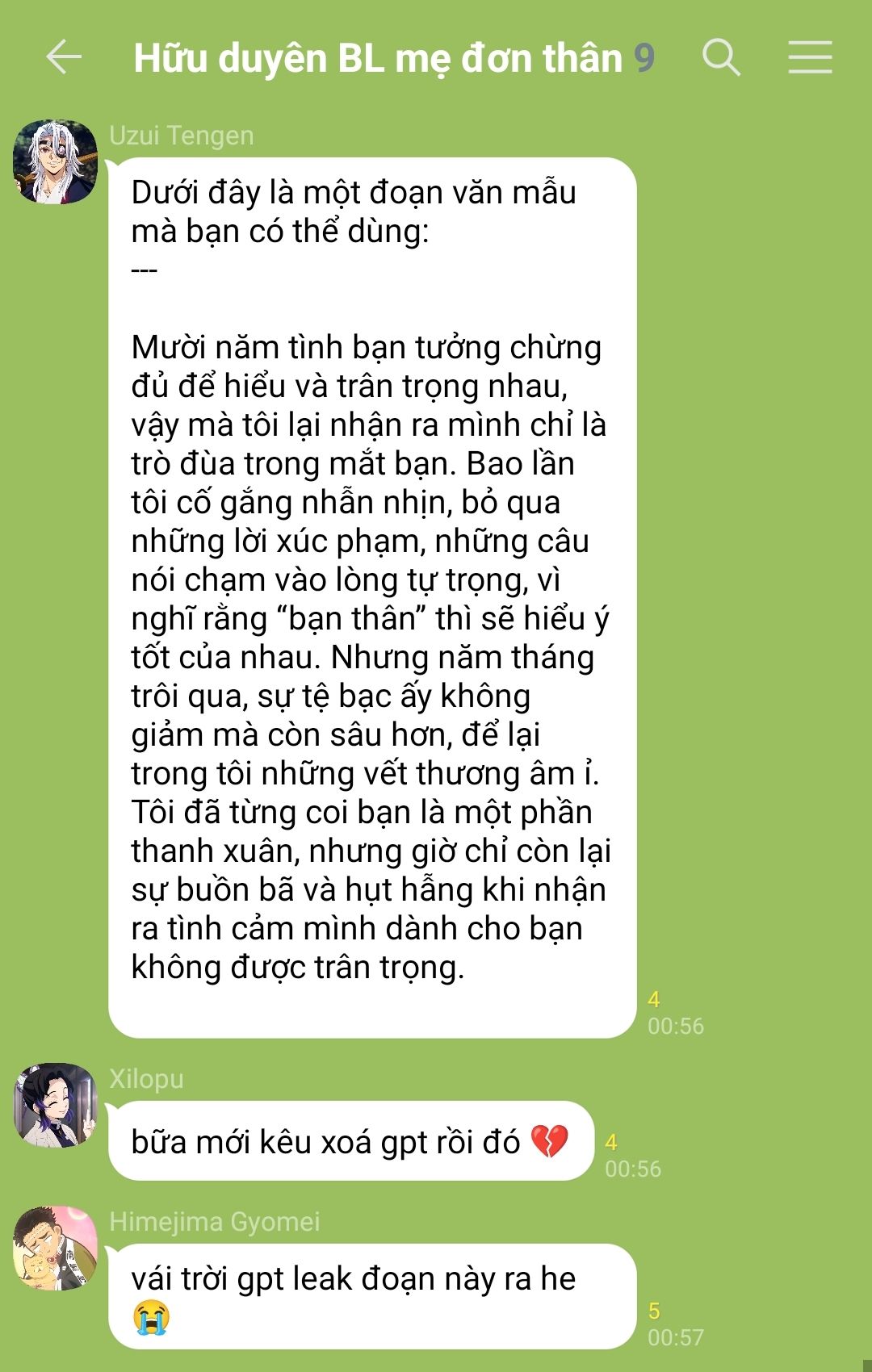 đêm đã khuya, ánh đèn trong phòng chỉ hắt ra một quầng sáng vàng ấm áp từ chiếc đèn bàn nhỏ. giyuu co người ngồi ở mép giường, tay ôm điện thoại, ngón cái lướt chậm trên màn hình, môi khẽ cong như đang cố kìm một nụ cười khi nhớ lại chuyện vừa xảy ra. ngoài hành lang, tiếng gió đêm nhẹ nhàng len qua khung cửa sổ hé mở, mang theo chút hơi lạnh khiến căn phòng càng tĩnh lặng.
