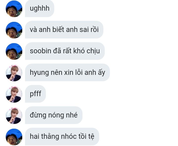 soobin nhíu mày nhìn lên yeonjun đang chuẩn bị đứng dậy và bước đi ra khỏi chỗ này. anh không nói gì thêm cả, ừ nhẹ một tiếng rồi lại tiếp tục chú ý đến beomgyu. nó nghe câu đó của anh yeonjun thì khóc ghê hơn. nó sợ rồi.