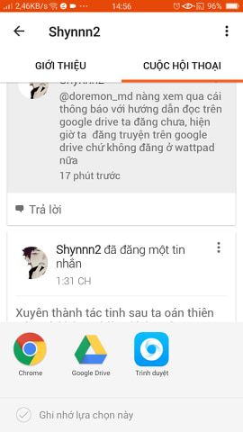 Các bạn tuyệt đối không được chọn Google Drive , vì nó load cho bạn tởn tới già luôn (=.= hoặc do điện thoại mình nó rởm) Nếu vô được thì các bạn có thể đọc không thì back lại và chọn cái khác thôi. Mình test thì thấy Google Chrome là load nhanh nhất rồi