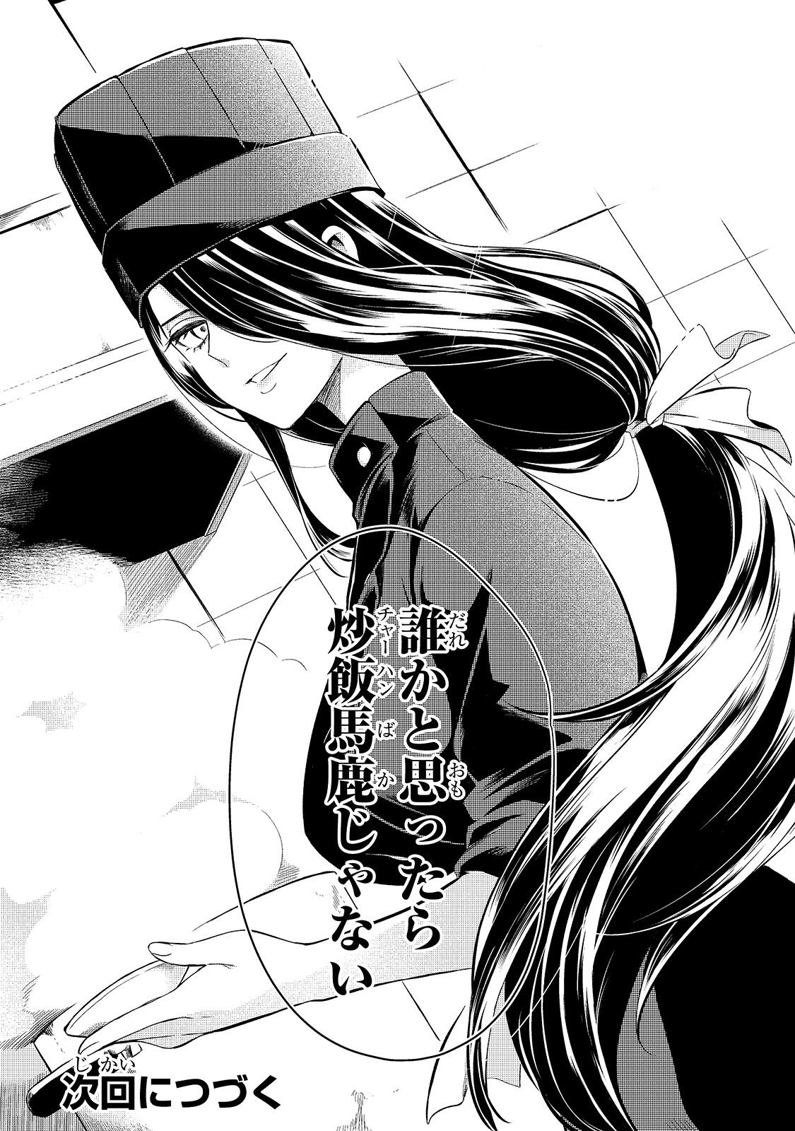 Một thiếu nữ đội chiếc mũ đầu bếp màu xanh, bằng chứng cho vị trí bếp phó, đã bước ra từ nhà bếp.