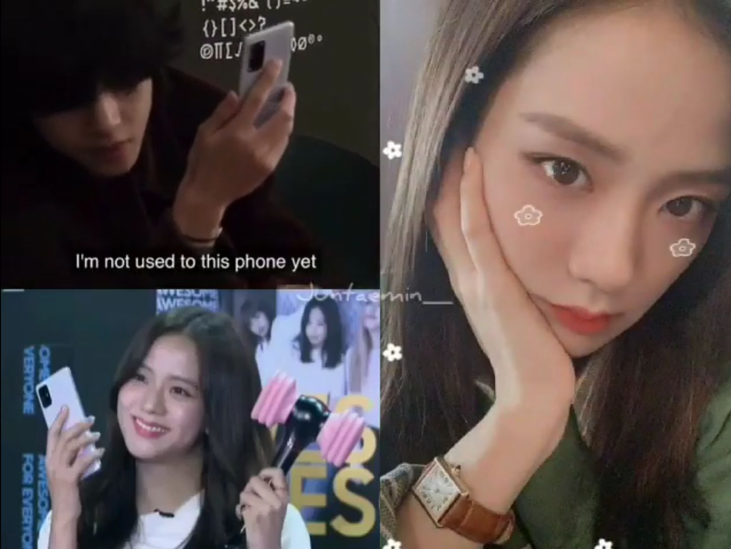 2.Và các cậu thấy gì không??Cartier🙊🙊🙉🙉 ó,Cartier ó!Như các cậu cũng biết TaeHyung và Jisoo cùng có và đeo Cartier phải 😻😽không?Có vẻ như hai người rất thích cái đồng hồ này,thấy đeo rất 💜💙nhiều luôn ớ.