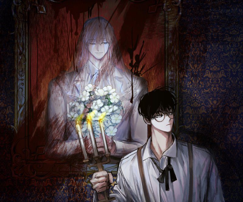 Hắn trùm tấm khăn mỏng. Đôi mắt khép hờ tựa như đang ngủ. Bộ âu phục trắng tinh khôi đang tôn thêm vẻ đẹp của hắn. Tựa như đoá hoa Phlox trắng mà hắn đang cầm trên tay kia. Tấm vải đỏ phía sau như đang nói trước điều gì.