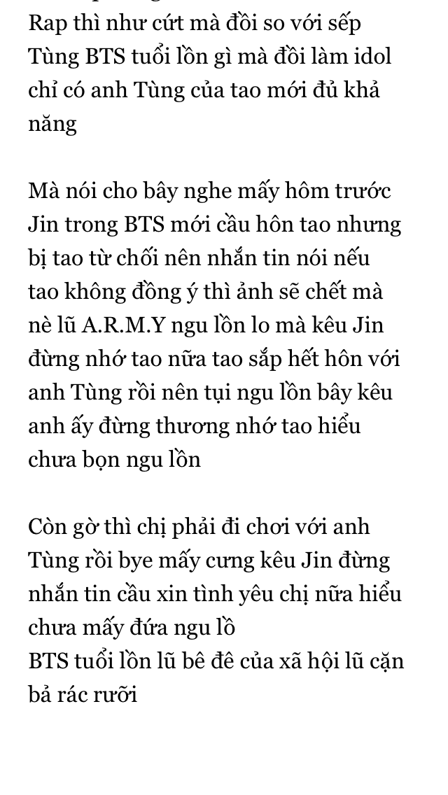 Mày bảo BTS là một lũ bê đê, vậy tại sao mày lại lôi Jin hyung vào? (Tui thích gọi hyung hơn là oppa, có gì thông cảm cái :Đ) Mày nói thật chị chả là cái qué gì đâu mà đòi yêu Jin hyung hay Sơn Tùng. Mày có thể xúc phạm tao hay các ARMY khác (xin lỗi các ARMY, tôi thật sự xin lỗi🙏 vì đã lôi các bạn vào, tôi cũng như các bạn thôi nhưng là ARMY ngầm:)) nhưng một khi đã đụng vào BTS thì mày đừng hòng mong tha thứ!