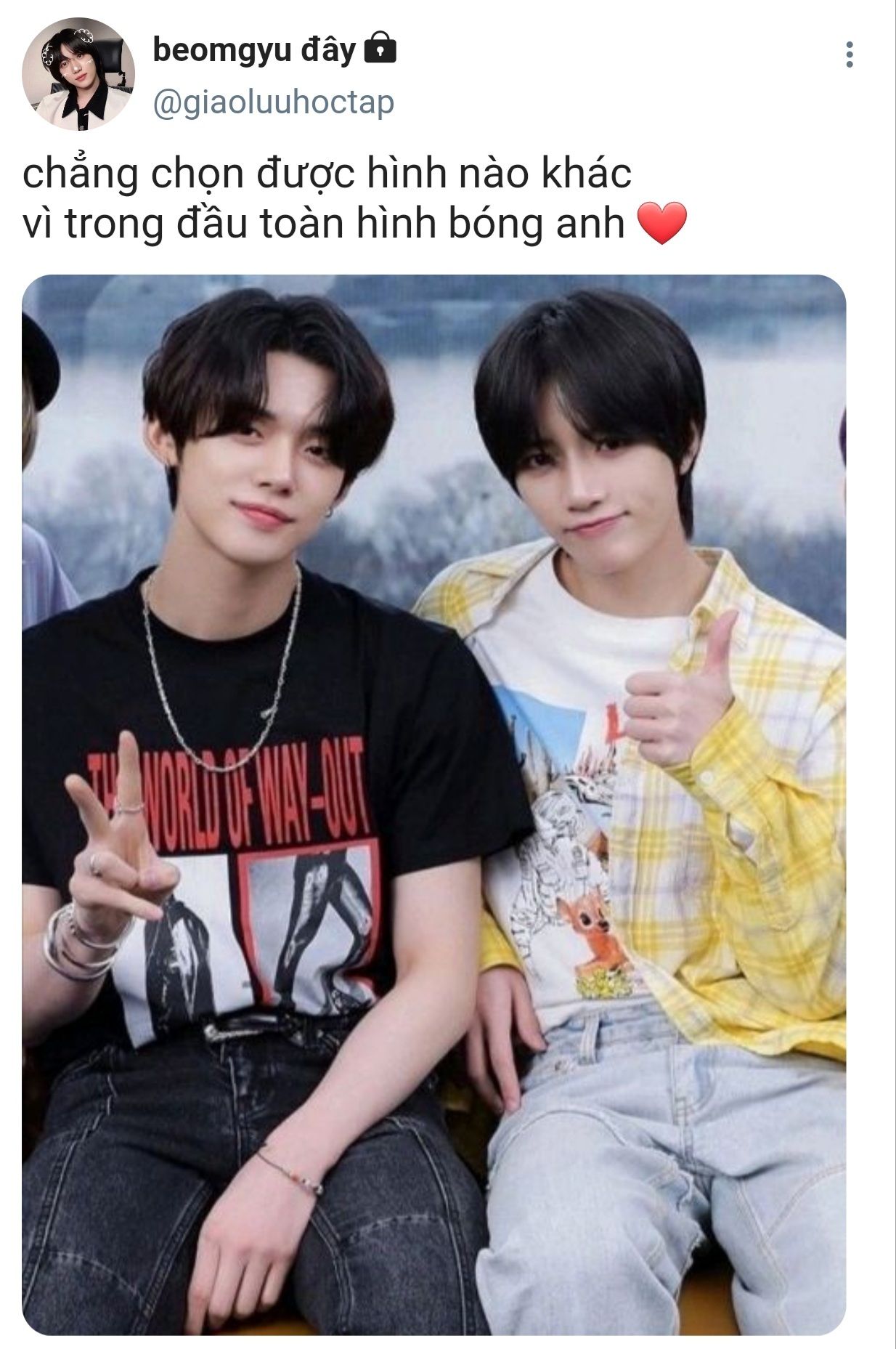 - beomgyu, trước khi em đến anh chỉ thích đánh nhau, bây giờ anh thay đổi rồi, anh thích đánh dấu tên mình trong trái tim em hơn.